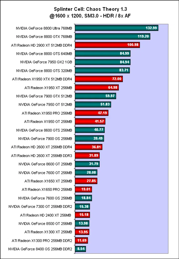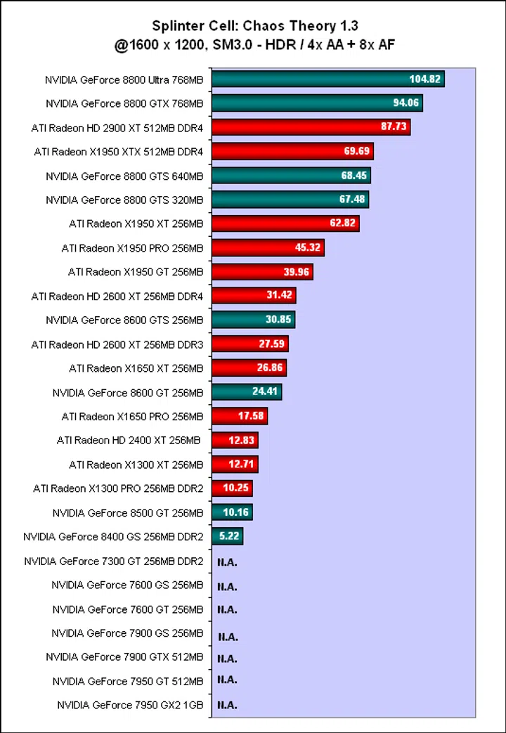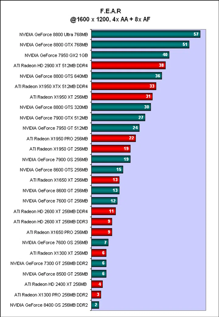The high-end GeForce 8800 cards were simply too fast, though the Radeon HD 2900 XT was again sandwiched on its own between the GTX/Ultra and the GTS. The lesser GeForce 8800 GTS series found themselves competing with the GeForce 7950 GX2, which probably shows that a multi-GPU setup, even an older one, still has its place. Former top cards like the ATI Radeon X1950 XTX also fared decently here, though the 8800 GTS has replaced them. Since the benchmark uses HDR rendering, the GeForce 7 cards were, like in 3DMark06, left out once anti-aliasing was enabled. Going by our results, the game becomes quite unplayable for the lower end segment and any card below a GeForce 7600 GT falls into this category. Unless of course if you would rather settle for less than perfect graphics quality, then these lower end segment cards can still tide you along.