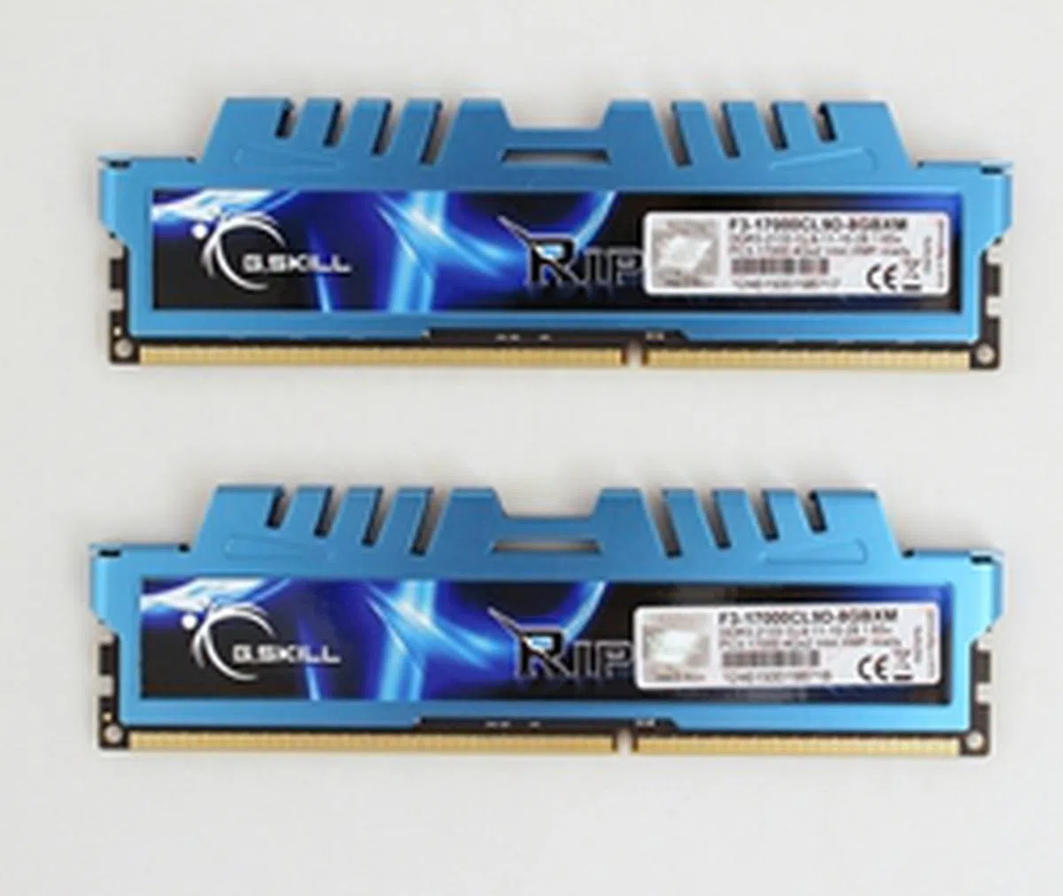 The G.Skill RipJawZ memory module sports a light blue heatspreader with teeth that vaguely resemble that of a buzzsaw.