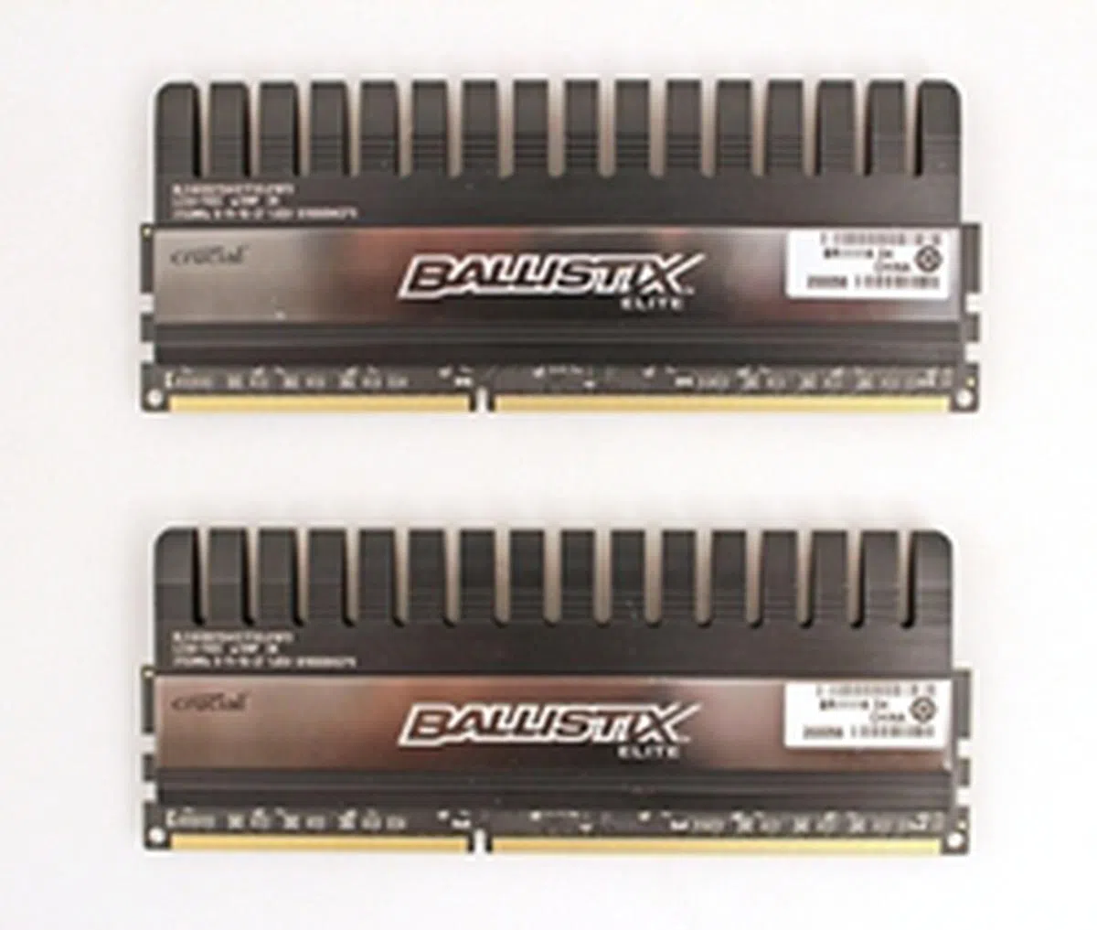 The Crucial Ballistic Elite Series memory modules appear to have their black heat spreaders extending from their black PCB.