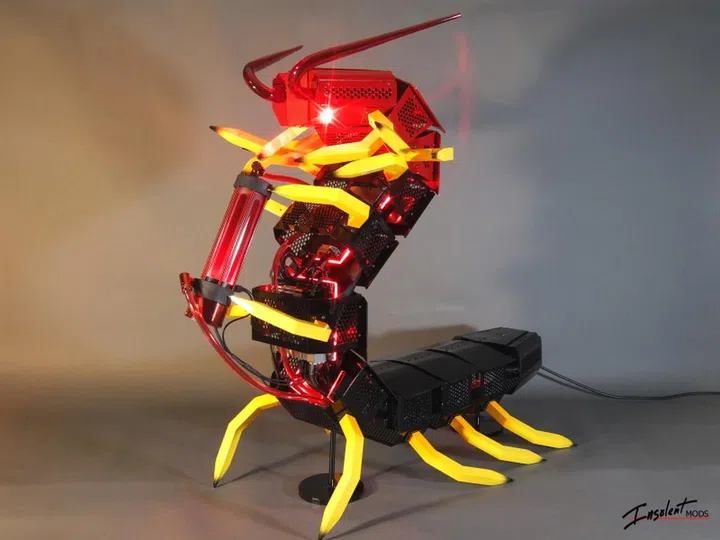 Meet Gigantea. Yup, that's a giant something alright. Based off the Cooler Master Elite 130, with a generous serving of legs on the side, this case is quite literally a robot centipede. It came in second in the Tower Mod category.