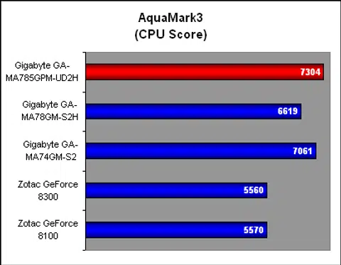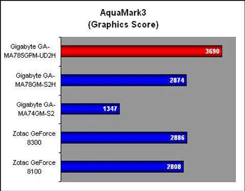 3DMark06 saw a rather significant 25% improvement for the AMD 785G over the 780G. Of course, with the core clock at the same frequency, this improvement can probably be attributed to the updated drivers on the 785G (circa Catalyst 9.7) but more importantly the additional SidePort memory on this board (as compared to our 780G board). AquaMark3 also witnessed a similar amount of improvement in the Graphics segment.
