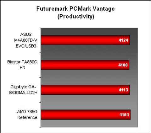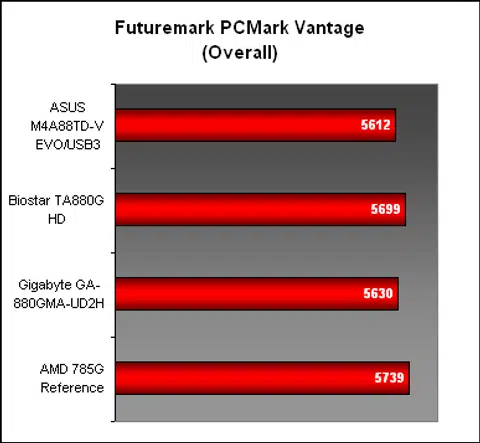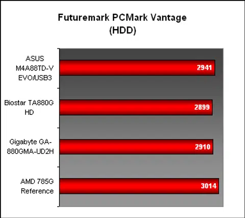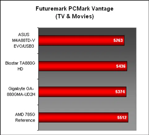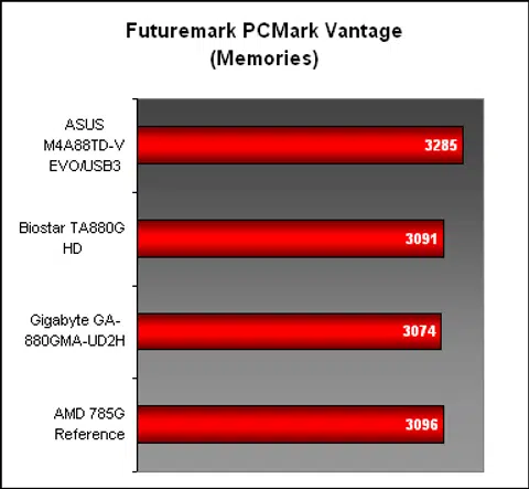 The next system suite, PCMark Vantage, confirmed the competitiveness of the AMD 785G against its successor. There's really not much point in upgrading for the sake of more performance if you already have this chipset, though the SATA 6Gbps support on the AMD 880G may matter to some. In the various subsections, the ASUS made up for a slightly below par performance in TV & Movies section with an improved showing in Memories. But besides that, all the AMD 880G were mostly evenly matched.