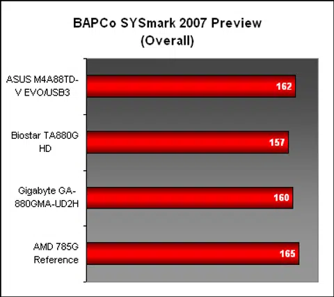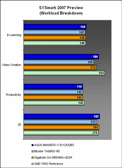 As you may have noticed, the AMD 785G happened to be our best performer overall in SYSmark 2007, with the rest of the AMD 880G boards following close behind. It's a clear statement that in terms of general system performance, you'll be hard pressed to pick one from the other, as the breakdown below further illustrated. Even the weakest performer here, the Biostar, was competitive enough in most of the tested segments, though its Video Creation score could be better.