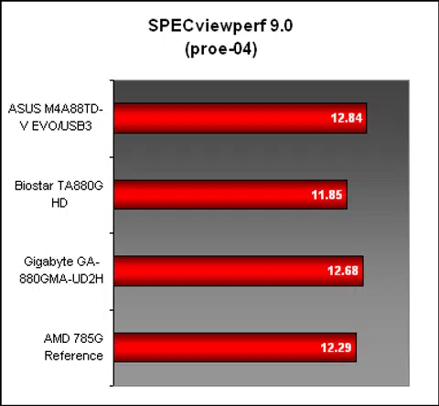 It's in SPECviewperf's 3dsmax test that we managed to find a board gaining an edge over the others. Here, we believe that the higher integrated graphics clocks on the ASUS board helped it to take pole position. Notice too that the 500MHz IGP clock on the 785G was the last board here, with the Biostar's 600MHz helping it to a slight lead over the Gigabyte. The next test, proe-04 viewset, stresses the CPU and memory subsystem and had little to do with the graphics prowess of the boards; as such the results outcome was quite different with the Biostar board slightly slower than the others.