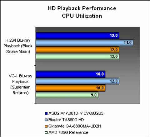 Blu-ray playback however depended solely on the UVD2 on the integrated graphics core and since all the boards have the same engine regardless of their graphics clock speeds, their performance remains mostly similar. The Biostar was marginally higher but at such relatively low CPU utilization, it doesn't really matter. It's safe to say that users should have no issues with playing back HD content on these motherboards with modern processors.
