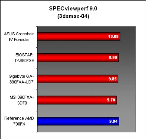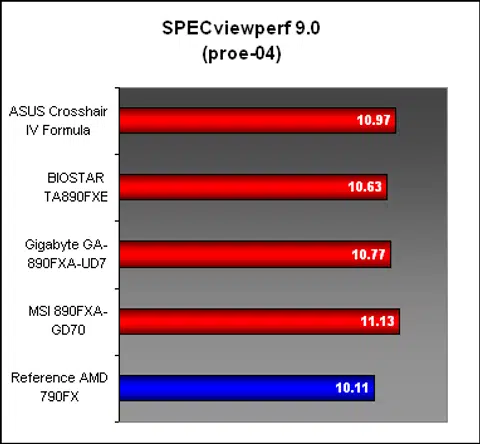 In these two workloads, there was a small amount of variance in scores, though on both occasions, the ASUS board was among the frontrunners. The MSI 890FX-GD70 also fared well in the PRO/ENGINEER workload, which from its workload we can relate that the board has better handling of the memory subsystem. Not surprisingly, the AMD 790FX chipset remains very relevant if performance is all that matters.