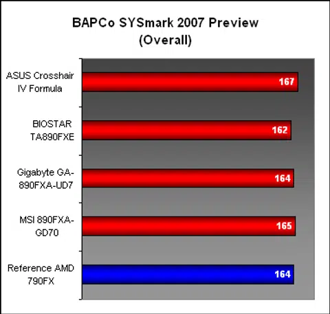 While the SYSmark 2007 scores were mostly similar among the boards, the ASUS managed to have the slightest of leads over the rest, with a stronger showing in the Video Creation segment. It's also important to note that the AMD 790FX essentially performed at the same level as the newer chipset.