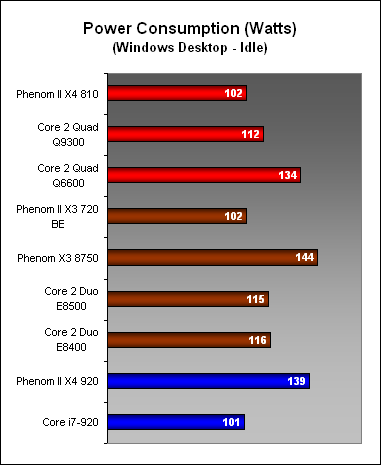 All doubts about these 95W Phenom II processors were cleared instantly in our power consumption tests, with the X4 810 easily drawing less power at idle and at peak than the 125W X4 920. Of course, the lower clock speed on the 810 could be a reason for this, though the 2.8GHz X3 720 also posted similar figures (after accounting for its one lesser core). Also, the MSI DKA790GX Platinum used to test the 95W Phenom IIs has been updated to BIOS version 1.6, which solved an issue where the C1E power consumption numbers were not as low as it should be. This issue affected our initial Phenom II testing (X4 940 and 920) so the gap between the 125W and 95W Phenom IIs should be a bit closer (~5W narrower) than suggested here.
