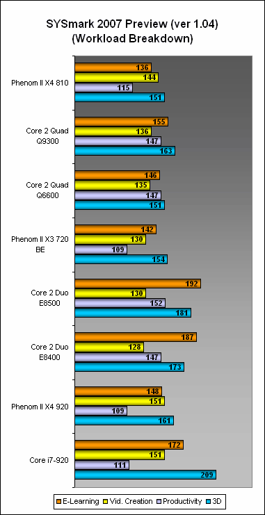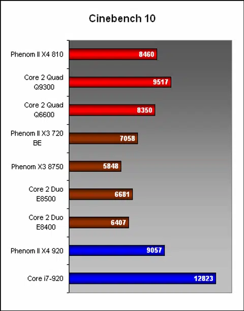 A note about the color coding for the benchmark graphs. We have placed the X4 810 and X3 720 against its closest competitors (we did have to replace the Q8200 with the Q9300 and Q6600). Hence, these 'groups' have distinct colors. Then we also included two sets of reference results, the Core i7 920 and Phenom II X4 920, which are in blue to distinguish them from the others.
