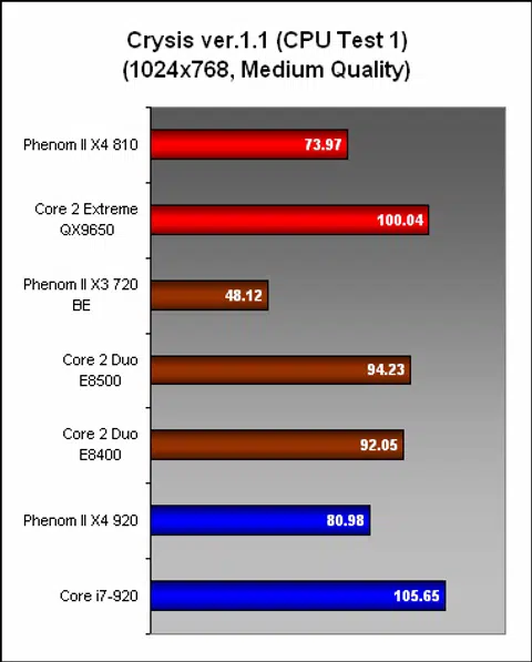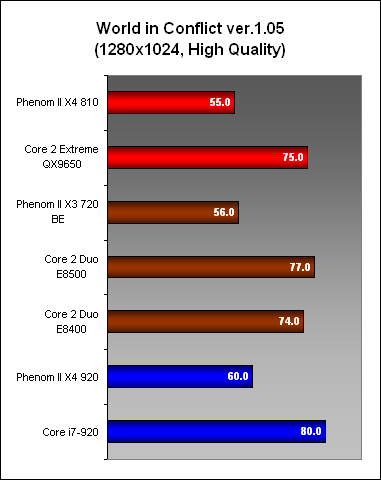 AMD may hope that its X3 720 could compete against the Intel dual-core but in games, it was not able to cut it despite its 2.8GHz clock. The dual-cores have higher clocks and they were simply better overall here in Crysis and World in Conflict. In fact, these dual-cores performed better than Phenom II X4 CPUs. More heavily multi-threaded games may help to narrow the gap between the Intel dual-core and the X3 but we're not betting on it.
