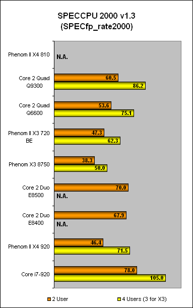 While these scores meant that the X3 720 was around 23% faster than the older Phenom X3 8750, it was still far from the Intel dual-cores here with their higher clock speeds, not to mention the Core i7, especially when it came to floating point performance. When it came to the two and four-user threads, the Phenom II processors were generally unable to keep up with their Intel counterparts, though the Phenom II X4 920 did match the Core i7 920 for int_rate for the four-user workload.