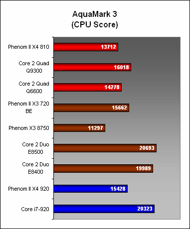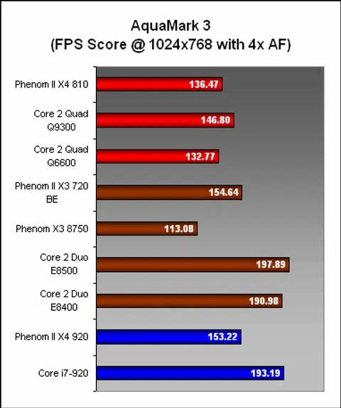 Clock speeds mattered more than the number of cores here in AquaMark3, as we saw the dual-cores running away with the lead, surpassing even the Core i7. It's no surprise then that the higher clocked X3 was leading the X4 810 here.