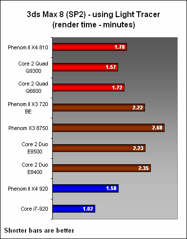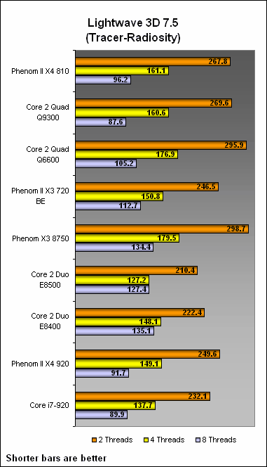 Moving on to Lightwave 3D, the Phenom II continued to fare decently against its competitors. The X4 810 was predictably slower than the quad-core Q9300, but it was dead even between the X4 and the Q6600 in Sunset, with the X4 having a slight advantage in Tracer-Radiosity. The X3 720 was initially slower than the Core 2 Duo processors at two-user threads but again, its triple-core came into play once the number of user threads were increased. At four and eight-user threads, the X3 was competitive with the E8400.