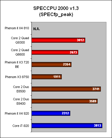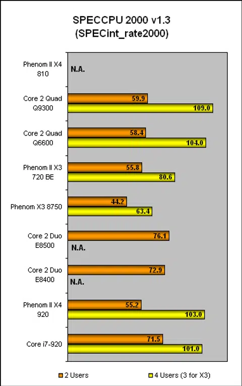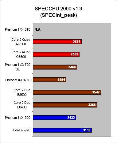 As usual, we started off with SPEC CPU2000 to find out the raw integer and floating point performance of these processors. Unfortunately, we ran into issues completing the benchmark using the Phenom II X4 810 and at the moment, we do not have the results for this processor. We did manage to get the results from the X3 720 'Black Edition' and the peak scores for fp and int appeared to be on par with the Phenom II X4 920. This made sense given that both CPUs are clocked at 2.8GHz, with similar L3 cache sizes. The HT bus on the X3 720 however is running a tad faster at 2.0GHz.