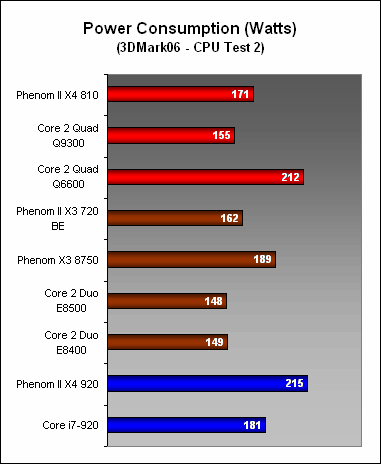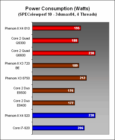 Looking at these results, the new 95W Phenom II processors generally consume less power than Intel's Core i7 processors, though the mainstream quad-cores from Intel (like the Q9300) still maintain the edge here when it comes to power efficiency, especially since the performance of the Q9300 is more than a match for the Phenom II X4 810. Finally, the 65nm Q6600 is looking its age when compared to the newer Intel quad-cores with its higher power draw.