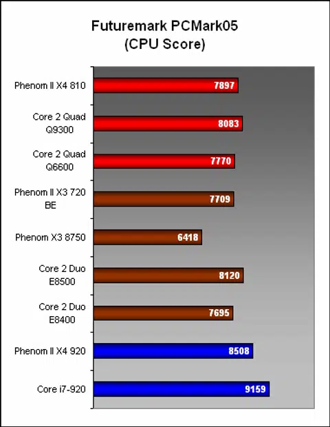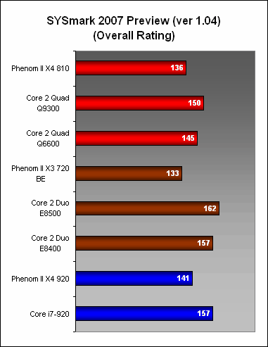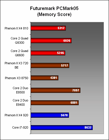 PCMark05 affirmed the potential of the Phenom II X4 810, as its CPU score here was only slightly behind the Q9300 and also faster than the Q6600. Hence, the chances of it winning against the Q8200 here appear to be high. The X3 720 was also another strong performer, beating its target, the E8400 narrowly. When it came to the memory subsection, the 4MB L3 on the X4 810 affected its performance, with the X4 losing out to the 6MB X3 720. Nevertheless, the Intel dual-cores were easily in front and the Core i7 920 was untouchable.