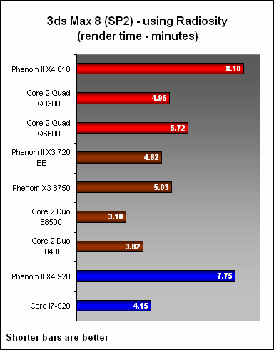 Another 3D rendering test, we rendered using 3ds Max 8's Light Tracer plugin first and found the X3 720 to be marginally in front of the E8500, which is good news for AMD. The X4 810 as usual was unable to match the Intel Q9300, but it should fancy its chances against the Q8200 given its close score with the Q6600. However, when we used the Radiosity plugin, the results were quite unexpected, with both Phenom II quad-cores taking a significantly longer time than the X3 models, including the Phenom X3 8750. We aren't sure why we are seeing such results and repeat tests yielded the same outcome.