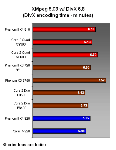 When it came to XMpeg encoding speed, the number of cores did not seem to matter as much as pure clock speeds, as the dual-cores and their higher clocks performed much better than the Phenom II processors and even the quad-core Q9300. This also meant that the X3 720 emerged faster than the X4 810.
