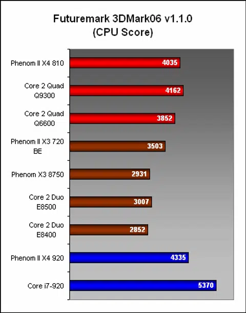 Both the Phenom II X4 810 and X3 720 did well in 3DMark06, scoring very competitively against its opponents. The extra core in particular paid off in the CPU score, with the X3 far ahead of the dual-core processors. The X4 810 was right behind the Q9300 and ahead of the Q6600, so the Q8200 should be right within its sight.