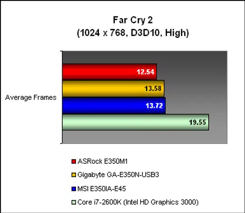 With its slower memory frequency of 1066MHz, the ASRock was slightly behind the other two boards in our gaming benchmarks. However, it's in these benchmarks that the Brazos platform showed its edge. In Quake 4 for example, the trio was significantly better than the Intel H55 or AMD 785G systems, which is quite commendable seeing the more powerful CPUs on the latter systems couldn't make up for the difference. Of course, it's still not that playable at around 25 fps, but it's close. They didn't fare that well in Far Cry 2, but the same could be said of Intel's latest, the HD Graphics 3000 on the Core i7-2600K.