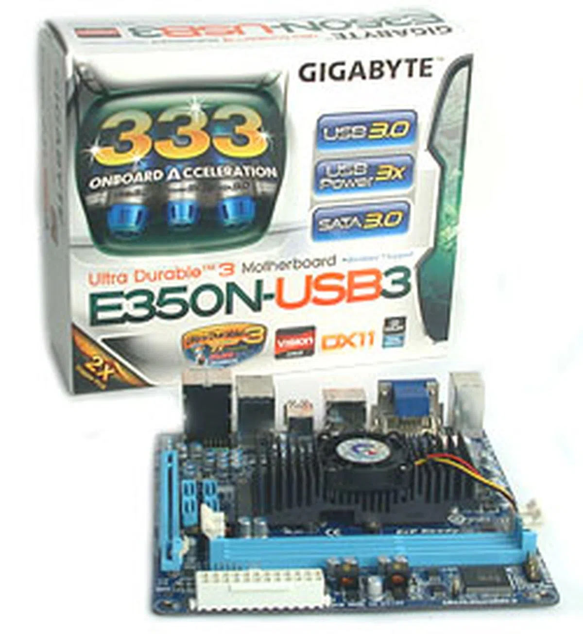 The next Brazos board, the Gigabyte GA-E350N-USB3, looks mostly similar to the ASRock, but Gigabyte has gone with a single, large heatsink for both the APU and the chipset, rather than two distinct heatsinks. Gigabyte also has added USB 3.0 ports.