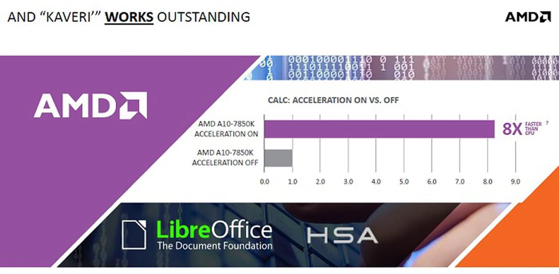 Surprisingly, AMD also showed that something as mundane as tackling daily work chores can benefit from AMD APU's HSA preposition. For example, in the latest build of LibreOffice, a free and open source office suite, the Calc application (the equivalent of Microsoft Excel) has been coded to issue OpenCL instructions for calculations which would then take advantage of GPU acceleration. Given the heterogeneous computing nature of the Kaveri APU, it will automatically utilize the appropriate 'compute core' for this task and thus accelerate the computational task. Here's a slide that shows the advantage of using its onboard GPU vs. executing the same task on the CPU when acceleration has been disabled:-