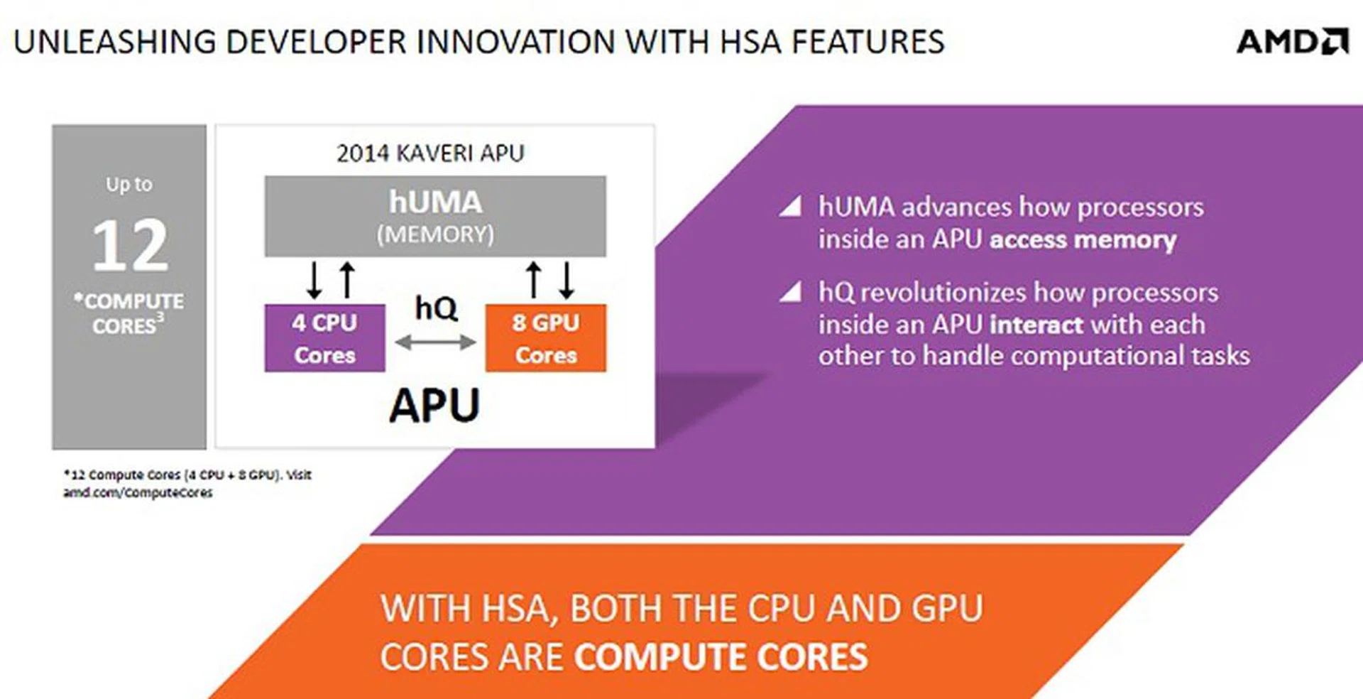 Disregarding the new features that Kaveri acquired from integrating a GCN architecture similar to the Radeon R290 series Hawaii graphics cores, the most radical change is that for the very first time, Kaveri enables the following:-