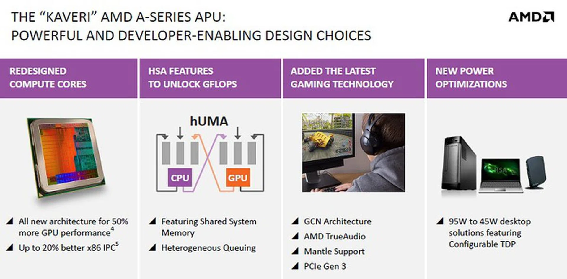 The Kaveri APU offers a big leap in technology and feature enhancements as it combines some of the best advances made in CPU and GPU development:-