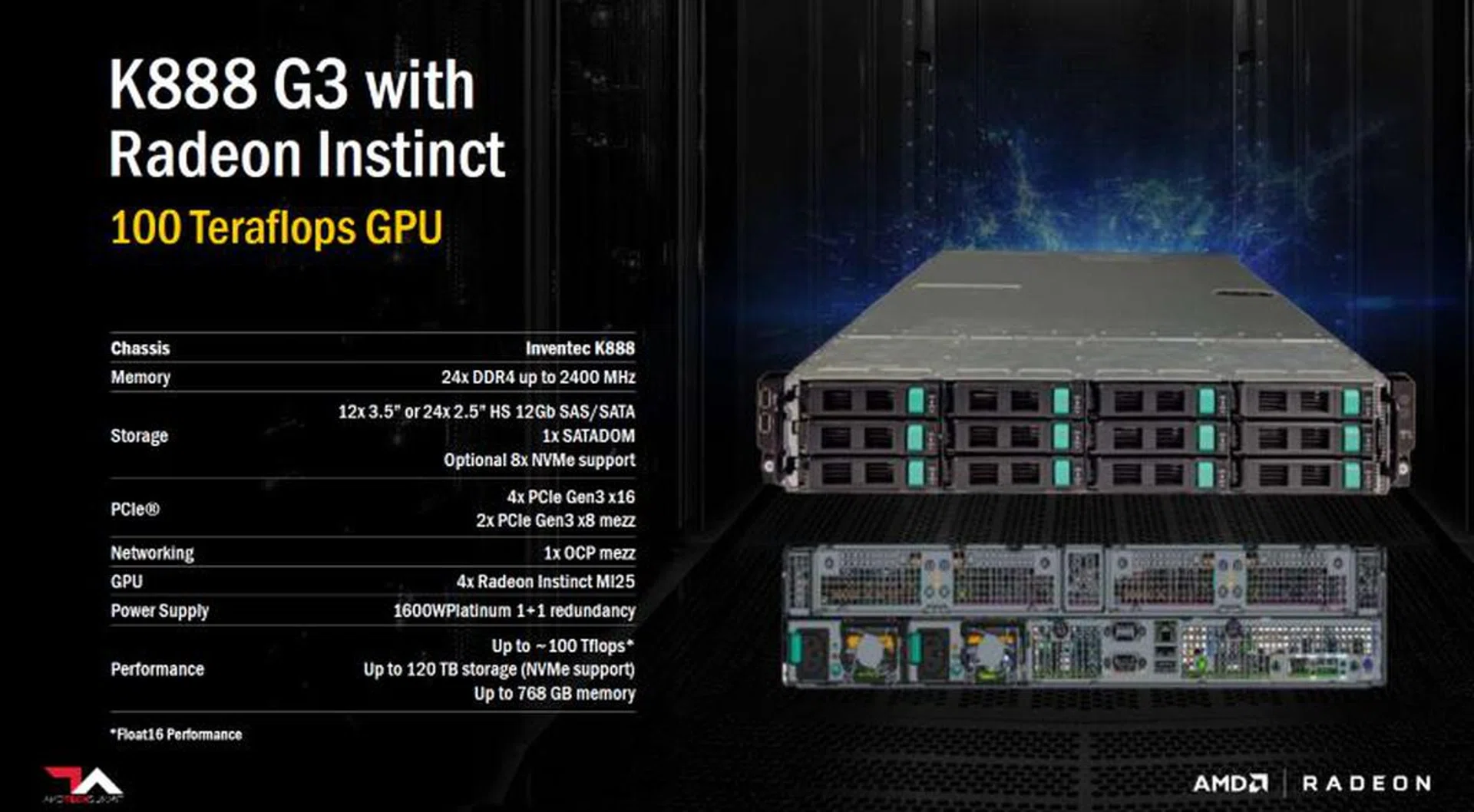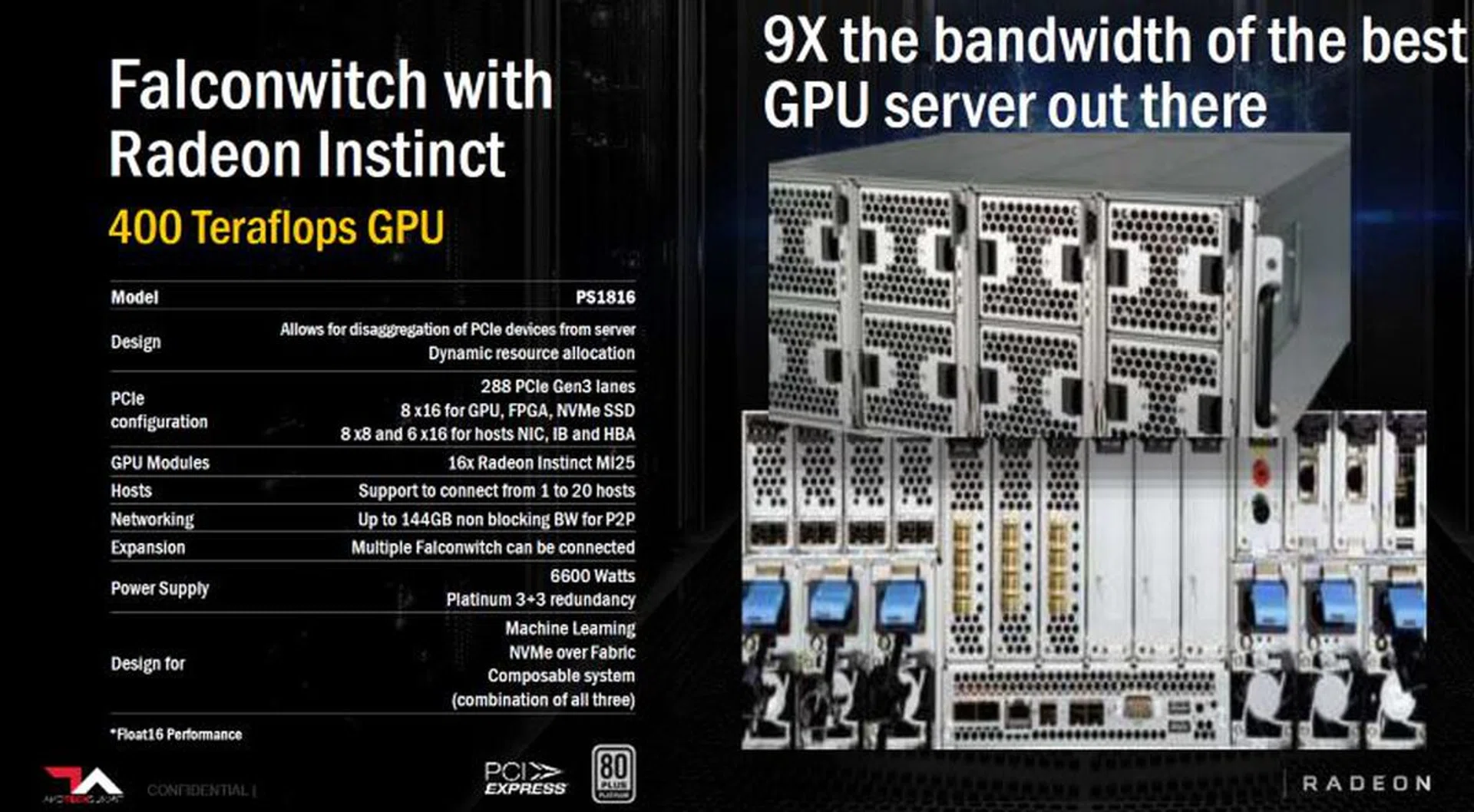 Now, if you were impressed with NVIDIA’s DGX-1 supercomputer announced earlier this year that featured 170 teraflops of compute performance with eight Tesla P100 GPU accelerators, AMD already has partners from Supermicro, Falconwitch and Inventec (to name a few), signed up to build Radeon Instinct servers. And some of the early specs we’ve seen put them in the range from 100 teraflops to 3 petaflops! That’s right, a 3 petaflop GPU supercomputer that will fit into one 39U server rack.