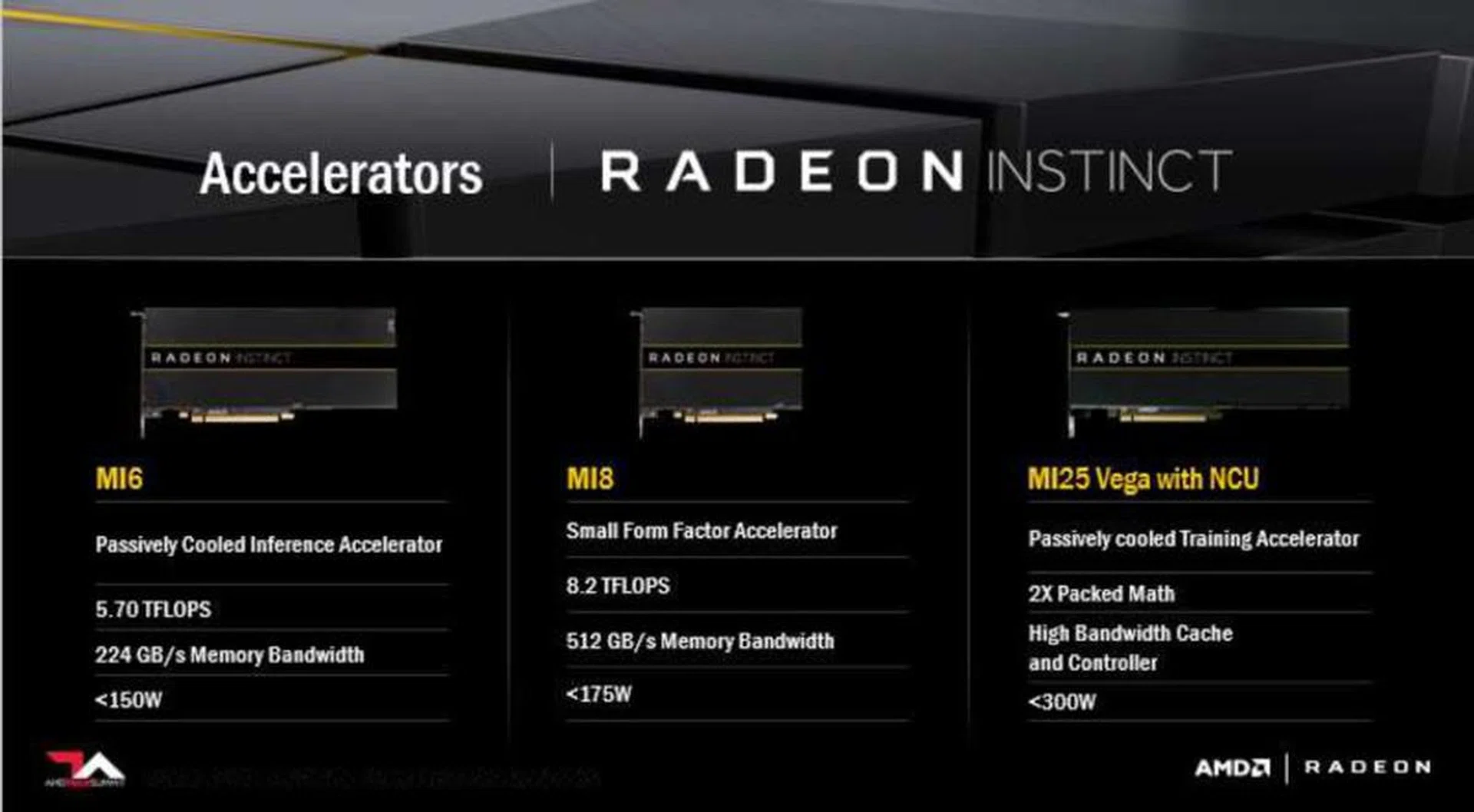 The Radeon Instinct MI6 is a Polaris-based accelerator with 5.7 teraflops of FP16 performance, 16GB memory and will operate at 150W with passive cooling. This card is optimized to be an inference accelerator.