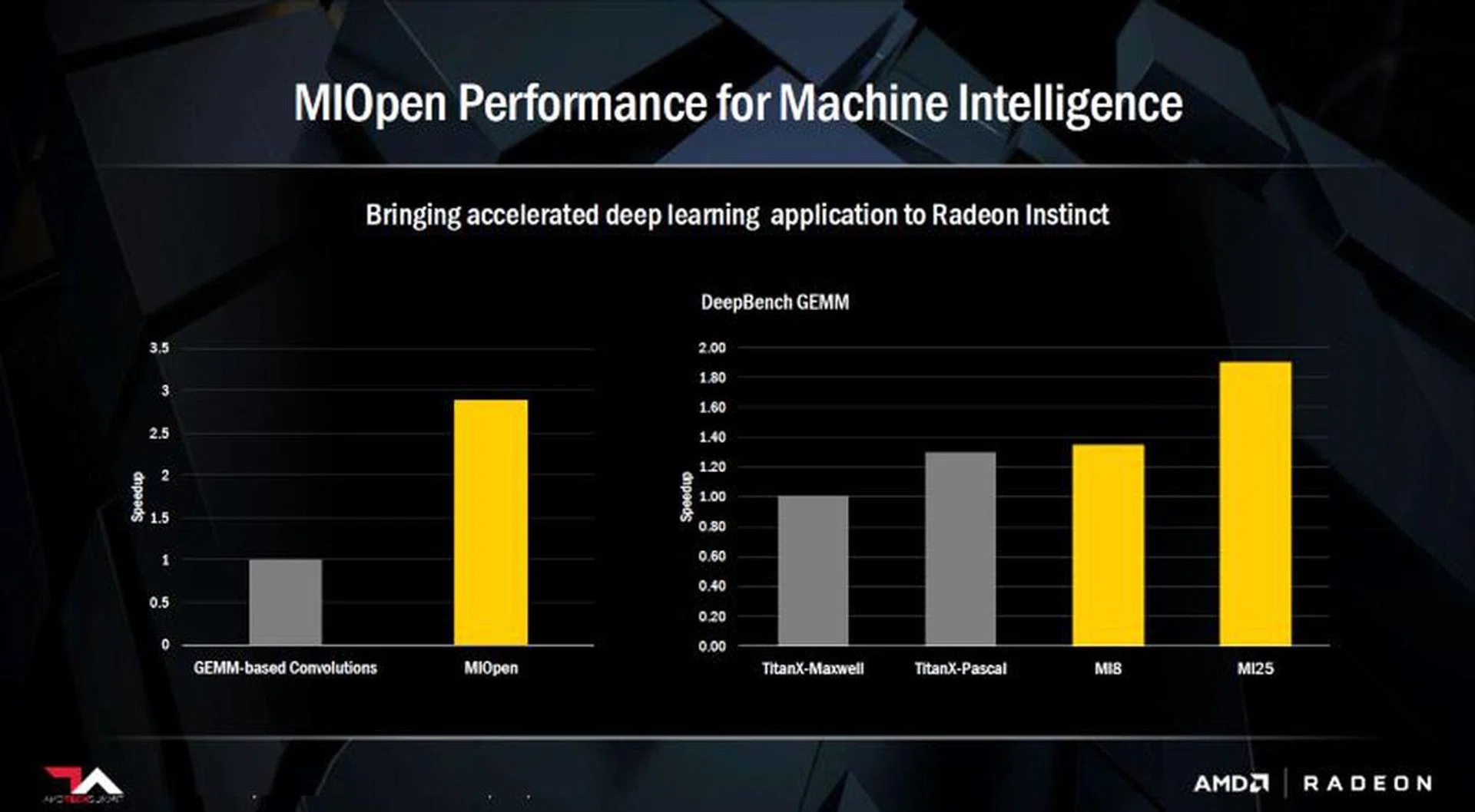 What we can tell you is that according to AMD, the Fiji-based MI8 is already able to outperform a Pascal-based TitanX in a DeepBench GEMM benchmark. AMD also claims their MIOpen library can offer up to 3x the acceleration with Radeon Instinct over the competition.