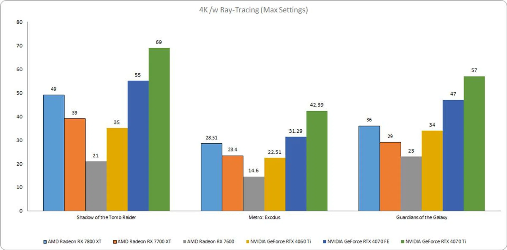 Ray tracing is where NVIDIA has more of an advantage. The GeForce RTX 4070 beat the RX 7800 XT by 11% its most significant lead so far. The differences were a bit murkier between the GeForce RTX 4060 Ti and the 7700 XT, but the former claimed a 15% advantage in Guardians of the Galaxy.
