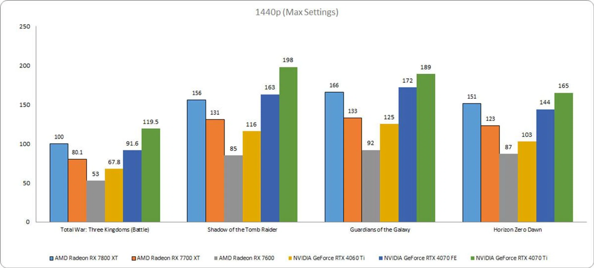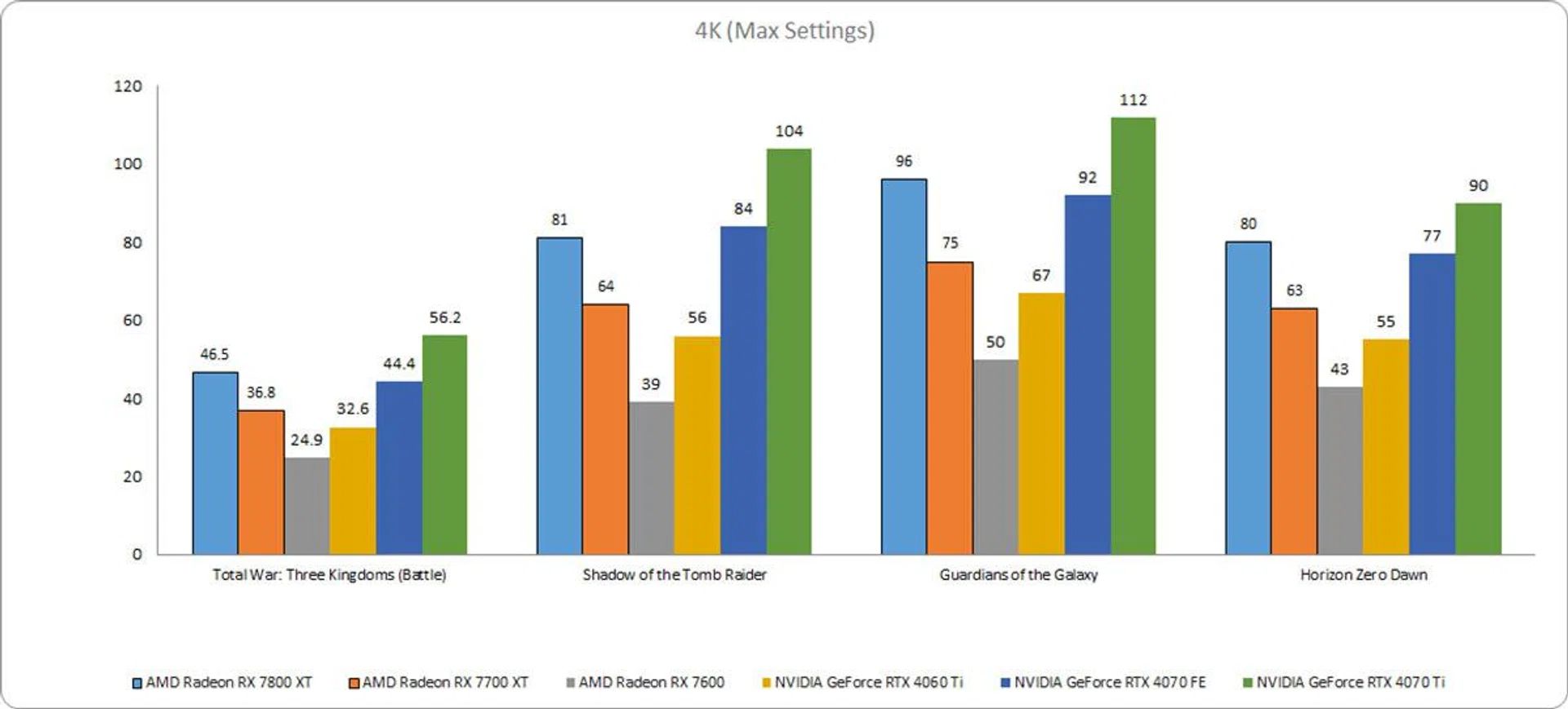 1440p resolutions are what the 7700 XT and 7800 XT were really designed for. Both cards managed over a respectable 120 FPS in three out of the four titles tested, except for Total War: Three Kingdoms.