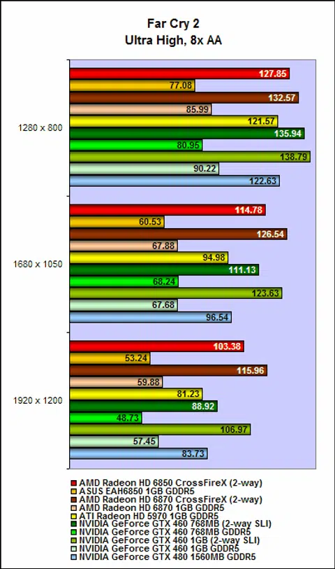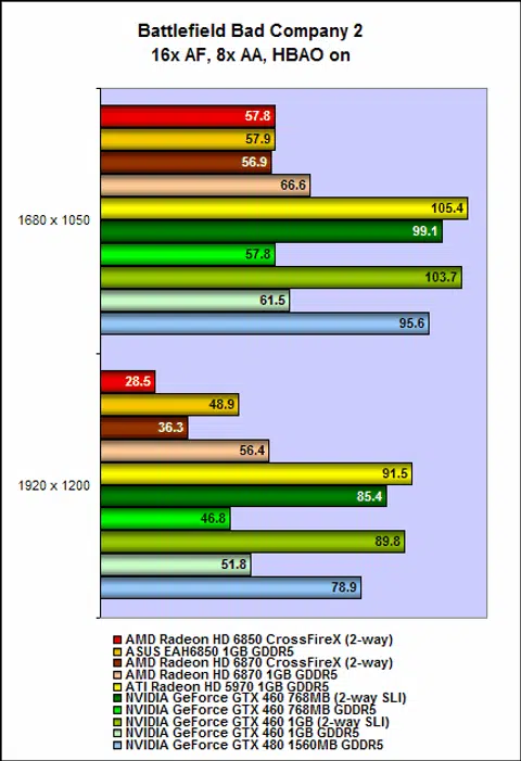 Two Radeon HD 6850 cards in CrossFireX can hardly be described as slow, seeing that it is marginally quicker than both the massively powerful dual-GPU Radeon HD 5970 and GeForce GTX 480, and is able to match two 768MB GeForce GTX 460 cards in SLI. However, it is markedly slower compared to two Radeon HD 6870 - by a good 10% overall. And on higher resolutions and more intensive settings, the gap can increase to as much as 17%.