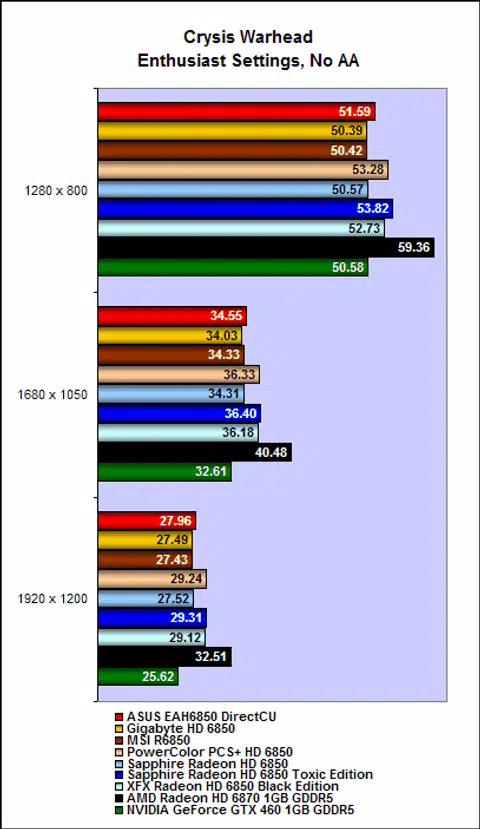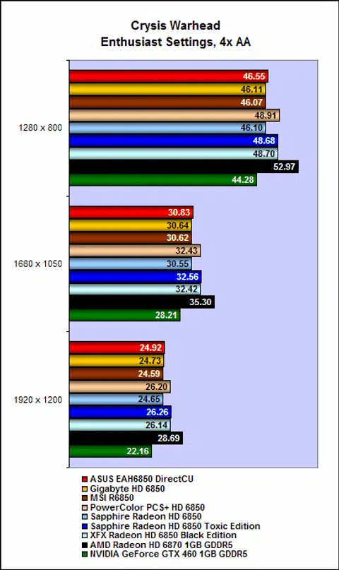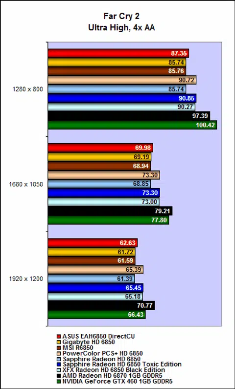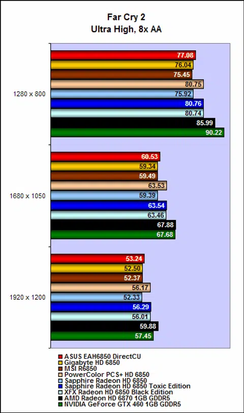 As we've mentioned earlier, clock speeds are a good indication of a card's performance and here we see the three reference clocked cards from Gigabyte, MSI and Sapphire posting nearly identical results on Crysis Warhead and Far Cry 2. The mildly overclocked ASUS EAH6850 DirectCU was a tad faster than reference clocked cards, whereas the trio of similarly factory overclocked cards from Powercolor, Sapphire (Toxic Edition) and XFX were the quickest of the lot. To add, despite being overclocked, the three cards were still no match for a reference Radeon HD 6870.