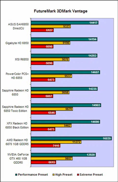 The three reference clocked Radeon HD 6850 cards from Gigabyte, MSI and Sapphire recorded very comparable scores, while the slightly overclocked ASUS EAH6850 DirectCU scored marginally better. Topping our collection of Radeon HD 6850 cards were the three factory overclocked cards from PowerColor, Sapphire (Toxic Edition) and XFX.
