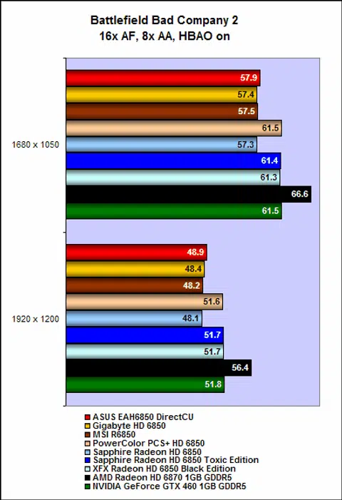 On Battlefield Bad Company 2, the differences in performance was more noticeable. The three cards from Gigabyte, MSI and Sapphire sporting reference clocked speeds all recorded nearly identical frame rates, while the slightly overclocked ASUS card was a bit faster. Lastly, the three factory overclocked "extreme" cards from PowerColor, Sapphire (Toxic Edition) and XFX were the quickest and again, because of their similar clock speeds, recorded frame rates that were very comparable. Another interesting note is the performance of the overclocked cards were matching the GeForce GTX 460 on this test.