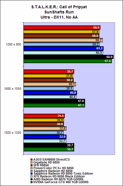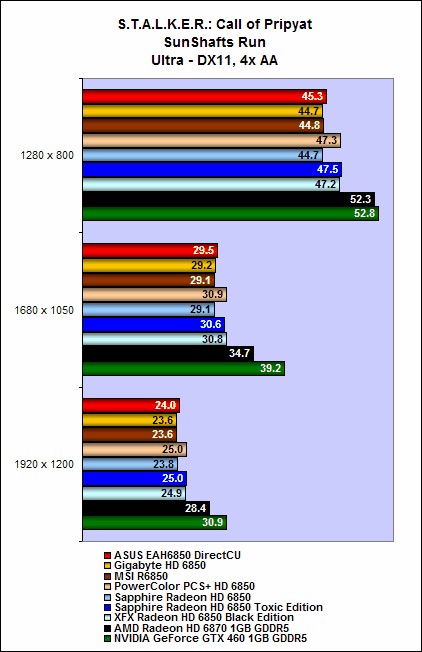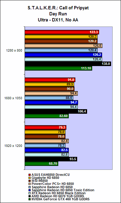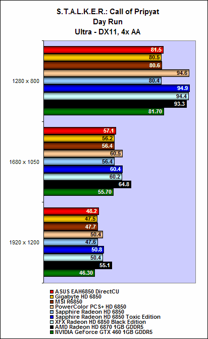 It was more of the same on S.T.A.L.K.E.R.: Call of Pripyat as we continued to see three distinct tiers of performance. The Gigabyte, MSI and Sapphire cards sporting reference clock speeds recorded almost similar frame rates while the ASUS card was slightly quicker, topping off were the three factory overclocked cards from PowerColor, Sapphire (Toxic Edition) and XFX.
