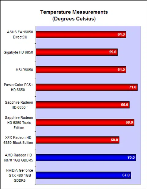 While clock speeds are usually a good indicator of a card's performance, there was no way of telling how effective a card's cooler is until we put it to the test. Although Gigabyte's dual-fan Windforce 2x cooler recorded the lowest operating temperature, XFX's custom cooler is arguably more effective if you consider that the card is factory overclocked in the first place. PowerColor's PCS+ cooling systems have been a bit disappointing of late and their PCS+ HD 6850 continued this trend as the card recorded the highest running temperature of 71 degrees Celsius.