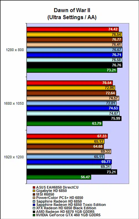 Dawn of War 2 is usually a very competitive benchmark and on the lowest resolution of 1280 x 800, it was impossible to separate the cards. However, as we increased resolution up to 1680 x 1050 and 1920 x 1200, we began to see a noticeable gulf in performance between the cards. Nevertheless, even at the highest resolution, all the cards managed very playable frame rates.