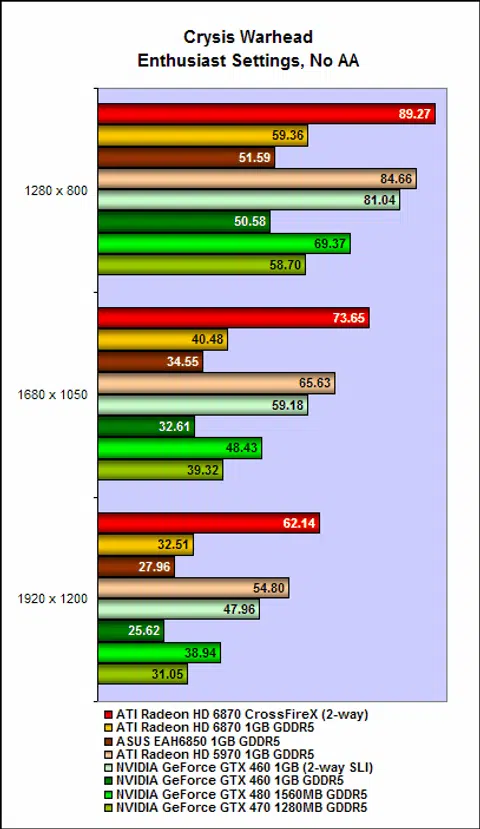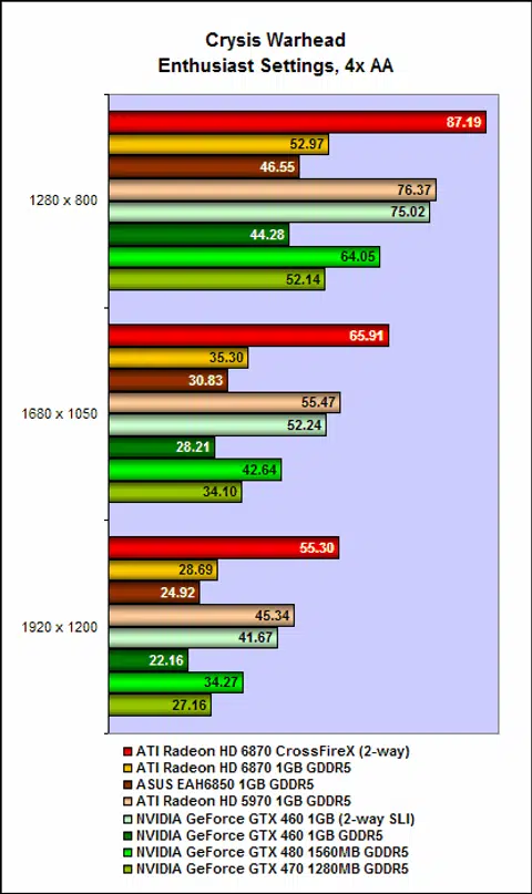 Against its main rival the 1GB GeForce GTX 460, we saw that two Radeon HD 6870 in CrossFireX is mostly quicker, and by a comfortable margin too. The Radeon HD 6870 really shines when the going gets tough, so in cases such as running Crysis at 1920 x 1200 with 4x anti-aliasing enabled, the pair of Radeon HD 6870 could be as much as 34% quicker than two GeForce GTX 460 in SLI.