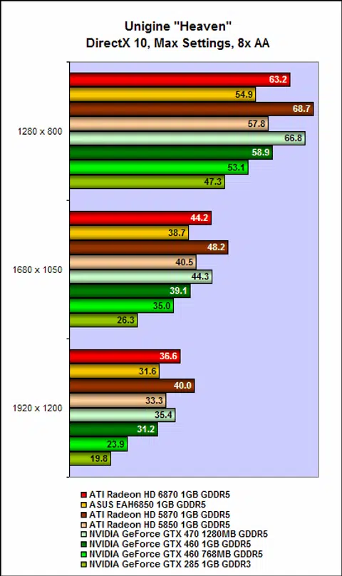 Sadly, the ASUS EAH6850 DirectCU was less impressive, because although it was easily quicker than the old Radeon HD 5850, the 768MB GeForce GTX 460 proved to be a right handful for it. Also, the GeForce GTX 470 was by far and away the fastest card, showing just how efficient the Fermi architecture is at handling tessellation.
