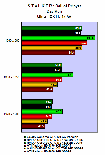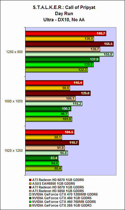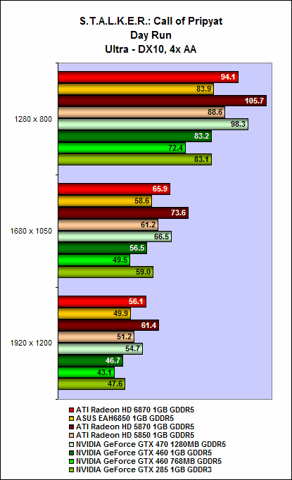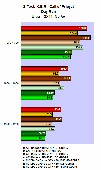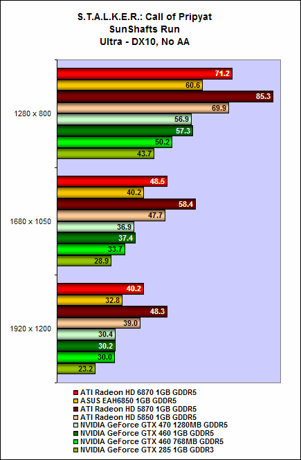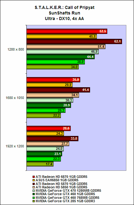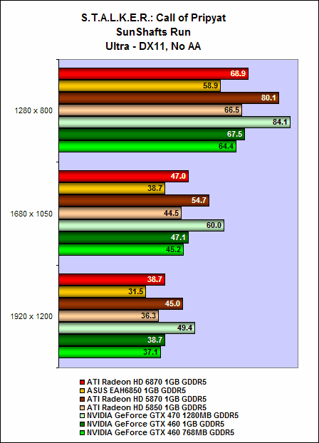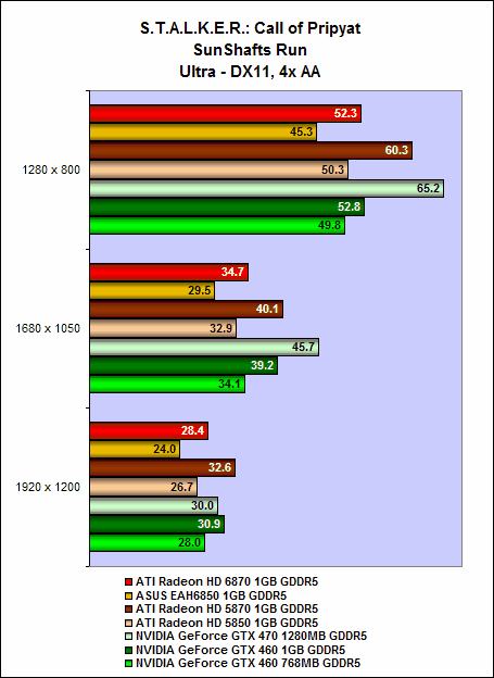 On the DirectX 11 runs of S.T.A.L.K.E.R.: Call of Pripyat, the new Radeons were off to a good start as they were significantly quicker than their rivals, but this was only on the Day run. On the SunShafts run, the GeForce GTX 460 fought back and was able to achieve parity with the Radeon HD 6870 while outclassing the less powerful ASUS EAH6850 DirectCU, which suggests that the Radeon HD 6870 and HD 6850 are not as adept at handling high dynamic range rendering as their rivals.