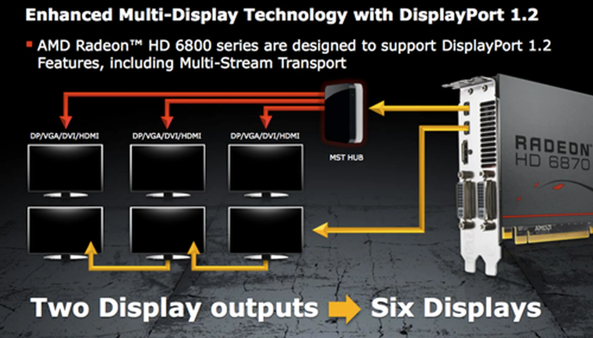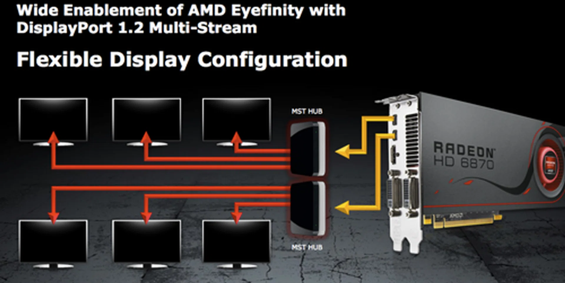 AMD has also upgraded the DisplayPort ports to version 1.2 and offers two of them. This new version has much higher throughput to support multiple displays from a single port and run them each at different resolutions; it even supports 3D output. The number of monitors that a single DisplayPort 1.2 port can drive is determined by the amount of available bandwidth, which in turn is dependent on the resolution that the display is running at. For example, a single DisplayPort can now drive up to four displays running at 1080p resolution via daisy-chaining or using a Multi-Stream Transport (MST) hub. If you up that resolution to 2560 x 1440, then a single DisplayPort 1.2 port has only sufficient bandwidth for two. And although it is possible for a single DisplayPort 1.2 to drive more than six monitors running at lower resolutions (such as 1366 x 768), AMD has limited the maximum number of supported displays to six (no matter what connectivity option is used), which should be more than sufficient.
