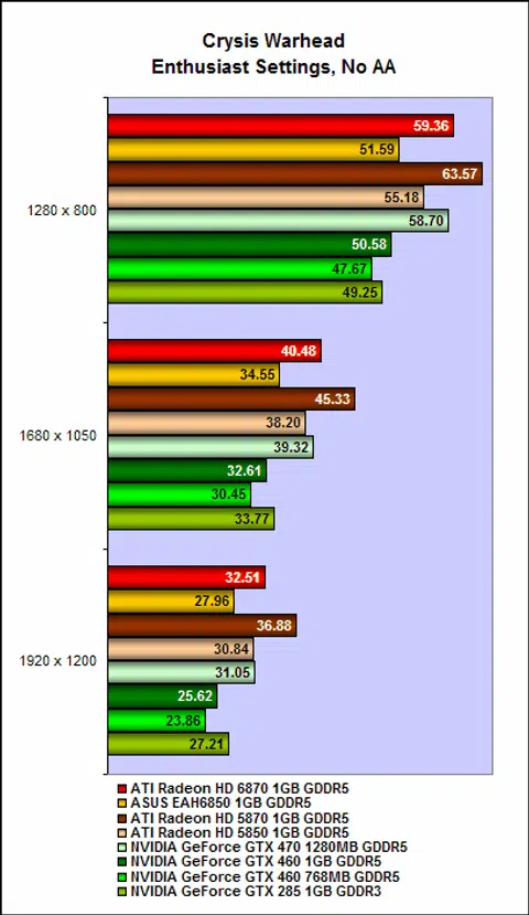 Moving on to Crysis Warhead, we get a taste of the Radeon HD 6800 series performance on real world gaming applications. The Radeon HD 6870 comfortably outperformed the old HD 5850 and was about 5% quicker overall. Against its rival, the 1GB GeForce GTX 460, it was about a whopping 20% quicker, which is impressive.