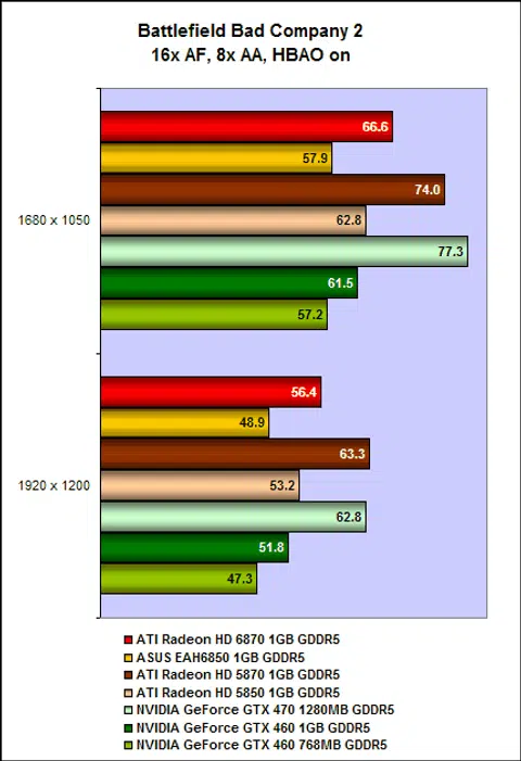 Tessellation was something that the old Radeon 5000 series cards weren’t very good at when compared to their NVIDIA rivals, and with the enhanced tessellation unit, AMD will be hoping that their new cards will be able to bring the fight to NVIDIA. On Bad Company 2, the Radeon HD 6870 was about 8% quicker than the 1GB GeForce GTX 460, whereas the ASUS EAH6850 DirectCU was a smidge faster than the 768MB GeForce GTX 460.
