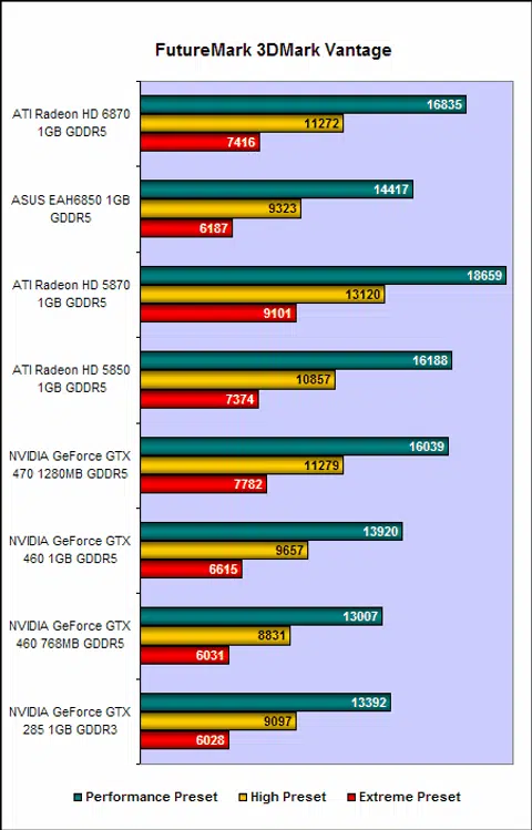 The two Radeon HD 6800 series cards started off brightly on 3DMark Vantage, posting scores that were within our expectations. The Radeon HD 6870 outscored the Radeon HD 5850 by a slight margin, whereas the ASUS EAH6850 DirectCU scored significantly lower. The powerful Radeon HD 5870 still reigned supreme, recording the highest scores of the lot.