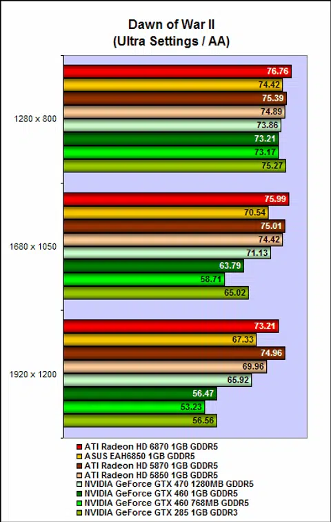 Dawn of War 2 is usually a very tightly contested affair and this time round wasn’t any different. At a resolution of 1280 x 800, all cards racked up nearly the same frame rates, but as we increased the resolution, and especially at 1920 x 1200, it was apparent which were the quicker cards. At this resolution, the new Radeon HD 6870 is certainly admirable, easily beating the 1GB GeForce GTX 460 by a massive 30%. It even outperformed the GeForce GTX 470.