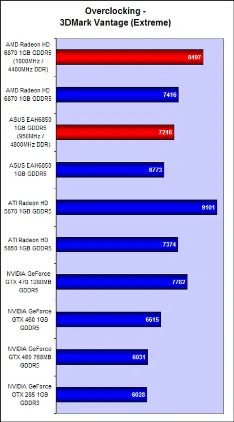 With the ASUS EAH6850 DirectCU, we were able to reach 950MHz at the core and 4800MHz DDR at the memory, which gave us 7216 3DMarks, an improvement of 5%. This was comparable to a reference clocked Radeon HD 6870.