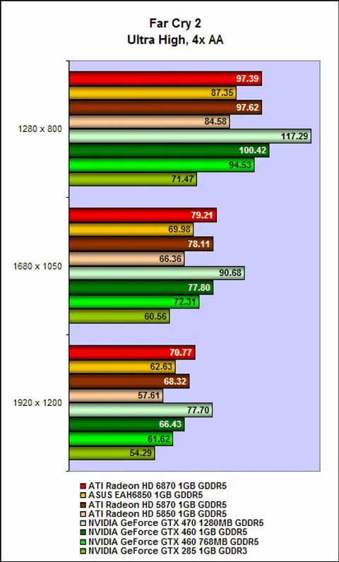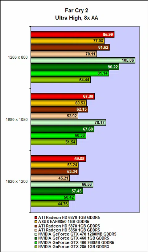 Far Cry 2 has traditionally been an NVIDIA stronghold, so to speak, seeing how well their cards perform on this benchmark, but it seems that AMD has gone to some lengths to improve their cards in this segment. Here, the Radeon HD 6870 was marginally quicker than the HD 5870, and was competitive against the 1GB GeForce GTX 460, taking a slight lead when we increased the resolution.